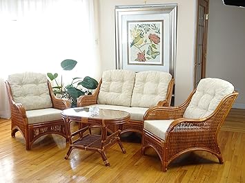 Jam Rattan Wicker Living Room Set 4 Pieces 2 Lounge Chair Loveseat Sofa Coffee Table Colonial Light Brown Cream Cushions