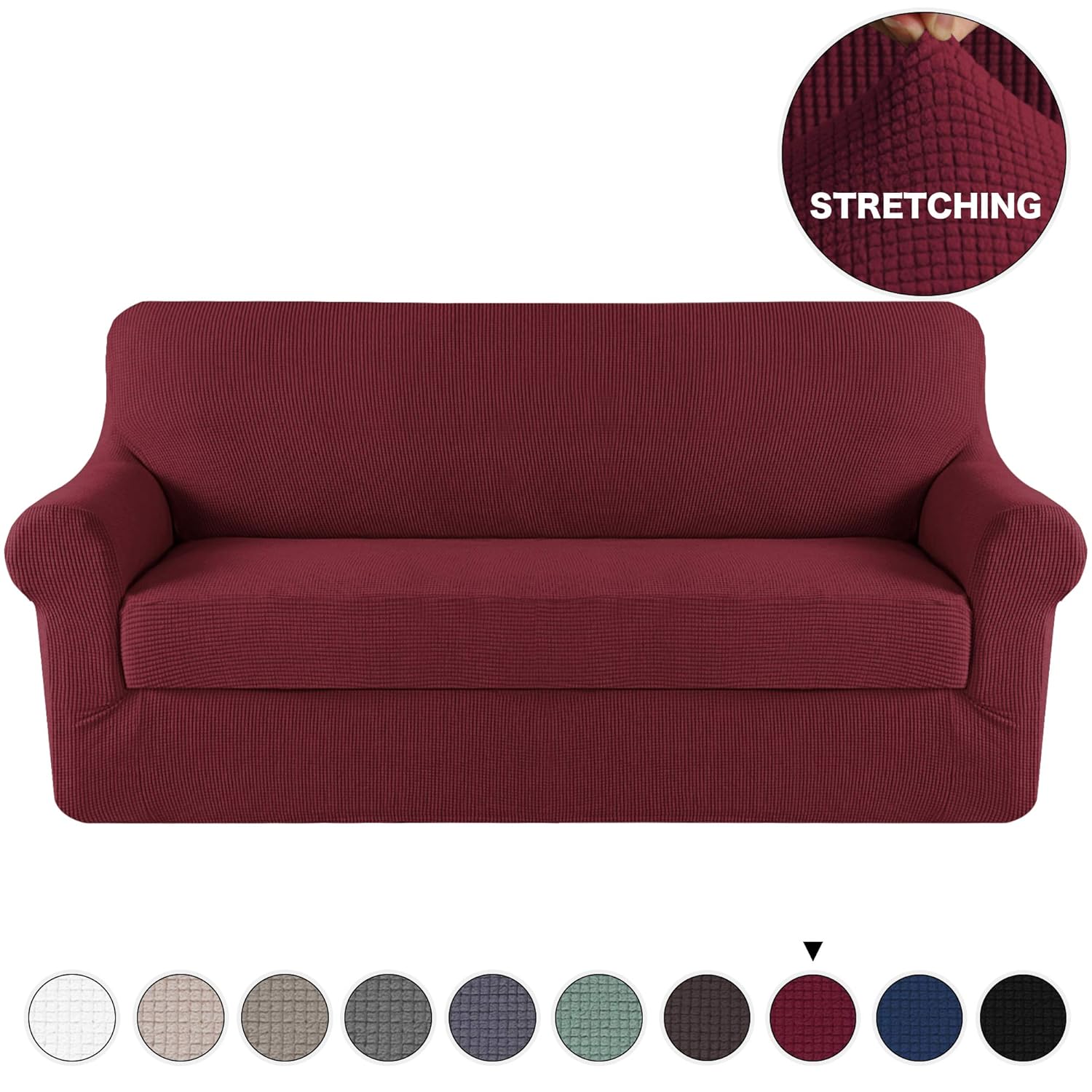 Spandex Sofa Cover Stretch Jacquard Furniture Protector 2 Piece Couch Cover Burgundy For 3 Seat Couch Slipcover Protector With Spandex Jacquard