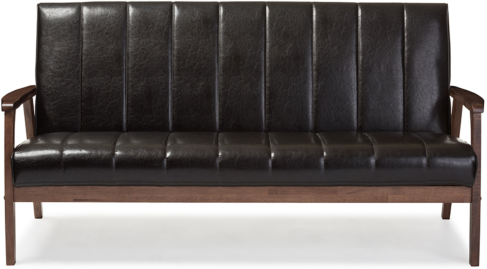 Baxton Studio Nikko Mid Century Modern Scandinavian Style Dark Brown Faux Leather Wooden 3 Seater Sofa